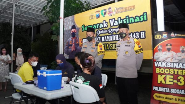 SIDOARJO. KemiriNews. Com | Saat Bulan Ramadhan, Polresta Sidoarjo bersama pihak terkait melakukan akselerasi vaksinasi Covid-19 usai Shalat Tarawih. Selain di gerai-gerai vaksinasi, kegiatan juga diadakan di sejumlah masjid.