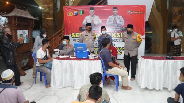 SIDOARJO. KemiriNews. Com | Antusias masyarakat untuk mendapatkan vaksinasi dosis ketiga (booster) masih tinggi. Seperti tampak dalam pelaksanaan vaksinasi keliling Polresta Sidoarjo di Masjid Baiturrahman, Jati, Sidoarjo, Rabu (6/4/2022) malam.