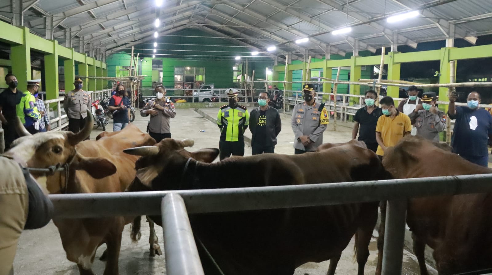 Kapolresta Sidoarjo melaksanakan pengecekan kesehatan hewan didampingi oleh dokter dari Dinpertan Sidoarjo sebelum dilakukan pemotongan, memastikan dalam keadaan sehat tidak terjangkit PMK.