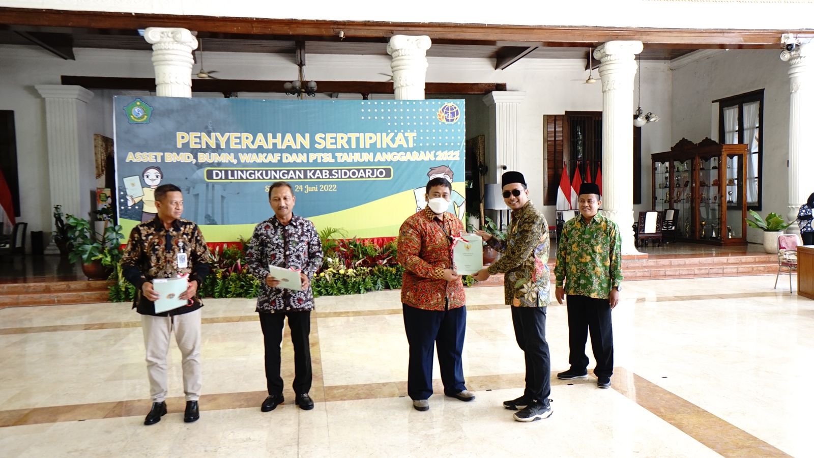 SIDOARJO. KemiriNews. Com | Bupati Sidoarjo Ahmad Muhdlor Ali, S.IP menyerahkan sertifikat Aset Badan Milik Daerah (BMD), Aset Badan Milik Nasional (BMN), wakaf dan PTSL tahun 2022, hari ini (24/6) di Pendopo Delta Wibawa.