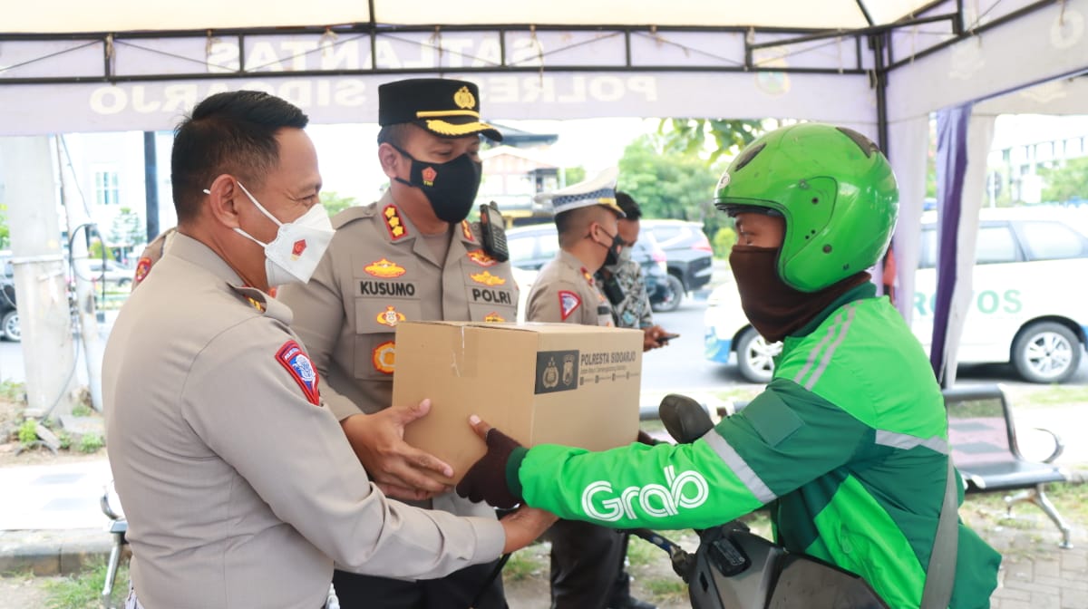 Kapolresta Sidoarjo Kombes Pol. Kusumo Wahyu Bintoro didampingi Kasat Lantas Polresta Sidoarjo Kompol Yanto Mulyanto membagikan paket sembako kepada pengendara ojol di sekitar Taman Pinang Indah Sidoarjo.