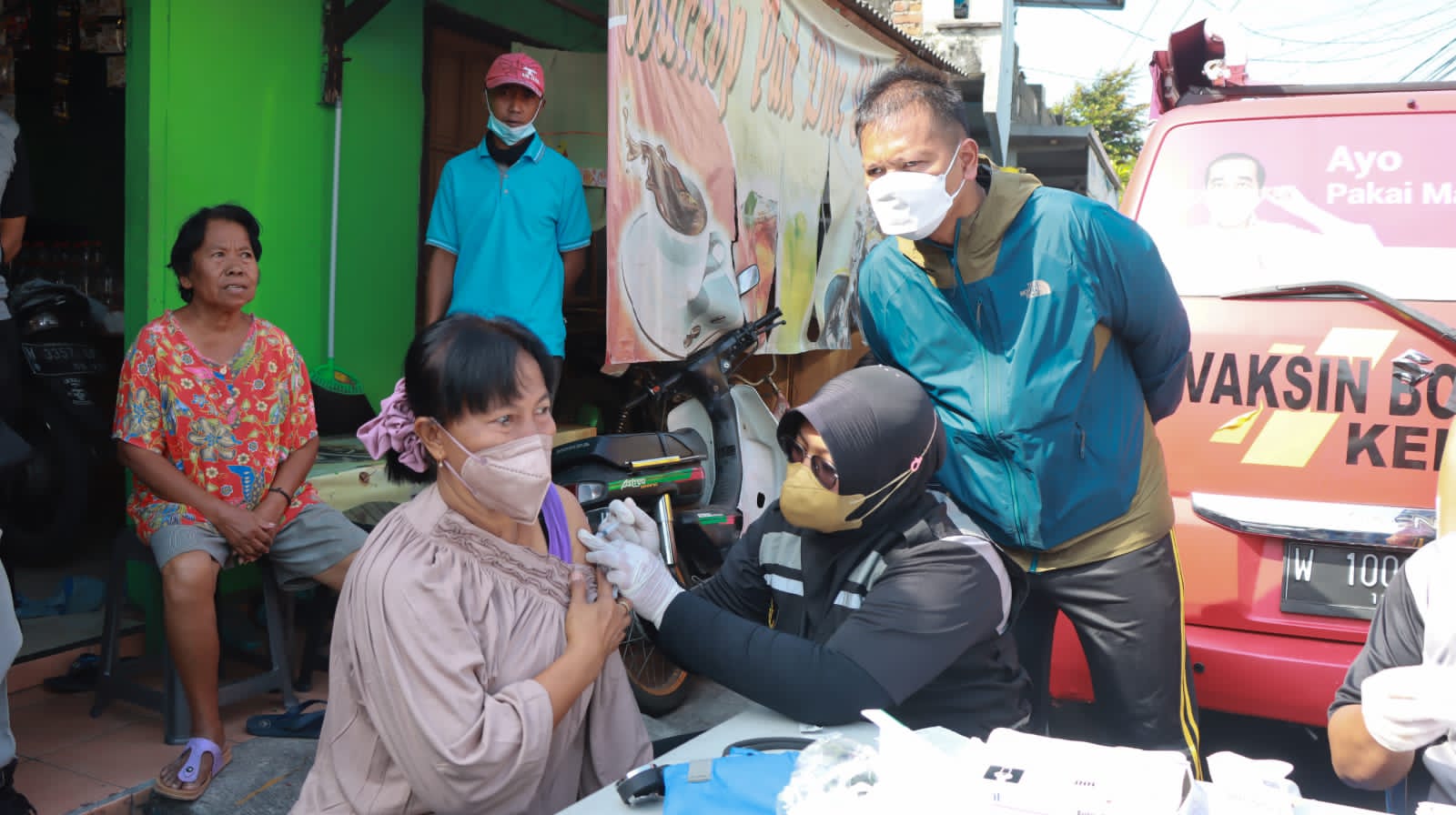SIDOARJO. KemiriNews. Com | Kembali Polresta Sidoarjo hadirkan layanan vaksinasi booster keliling ke pelosok desa. Sabtu (17/9/2022) pagi, mobil vaksin tersebut melayani masyarakat di Pasar Kaget Waru, Sidoarjo.
