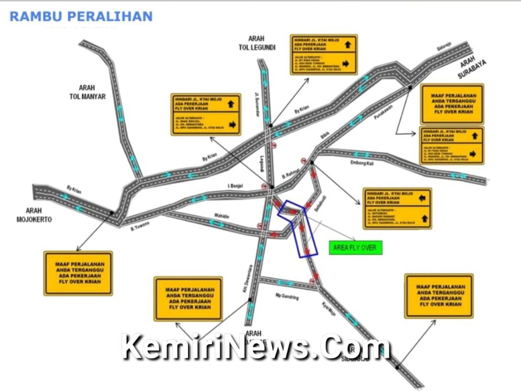 SIDOARJO. KemiriNews. Com | Pembangunan Flyover JPL 64 Krian sudah dimulai konstruksinya. Rekayasa arus lalu lintas jalan Kyai Mojo dan jalan M. Yamin yang menjadi titik lokasi pembangunan tengah dilakukan Dinas Perhubungan Pemkab Sidoarjo. Oleh karenanya masyarakat diharap menghindari ruas jalan tersebut. Saat ini Jl Kyai Mojo ditutup separuh dan diberlakukan satu arah. Kendaraan yang datang dari arah Wonoayu diarahkan ke jalur alternatif Jl. Mpu Gandring.