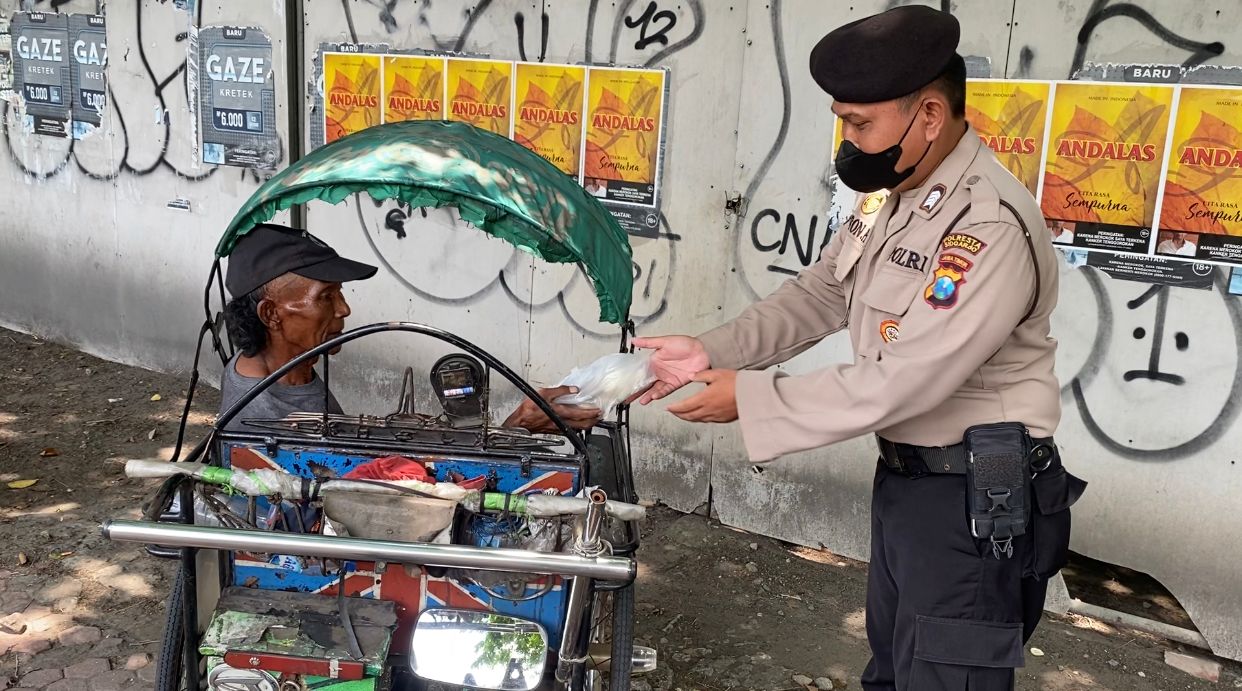 Anggota Samapta Polresta Sidoarjo membagikan makanan kepada masyarakat yang membutuhkan sembari melakukan patroli di daerah hukum Polresta SIdoarjo. Kegiatan patroli sambil sedekah tersebut sudah menjadi rutinitas yang dilaksanakan setiap hari Rabu dan Jumat.
