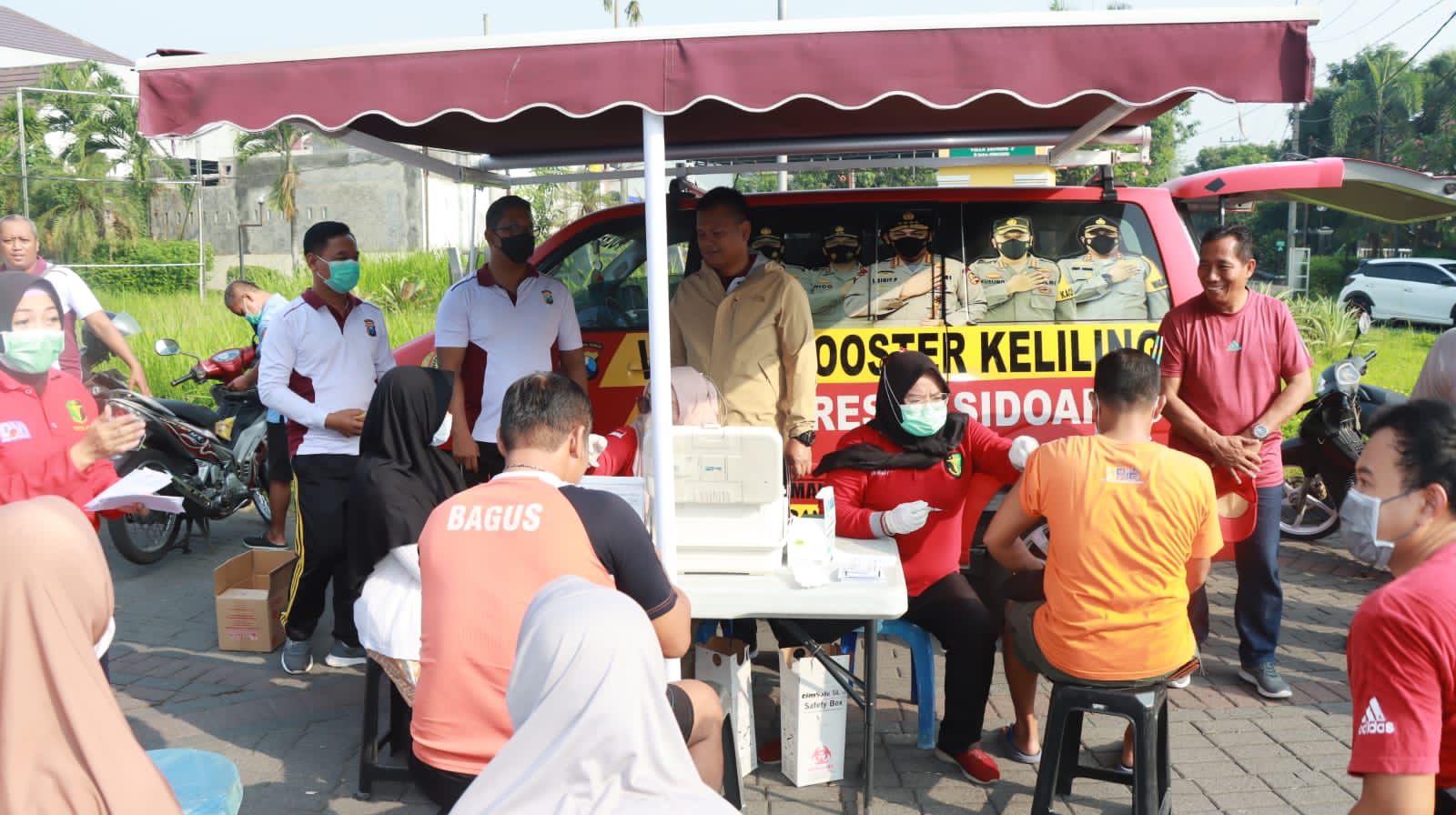 Mobil vaksinasi yang dihadirkan Polresta Sidoarjo, sebagai layanan jemput bola guna memudahkan masyarakat agar dapat terlayani dengan baik. Dalam hal ini layanan vaksin booster sebagai upaya mencegah penyebaran Covid-19.