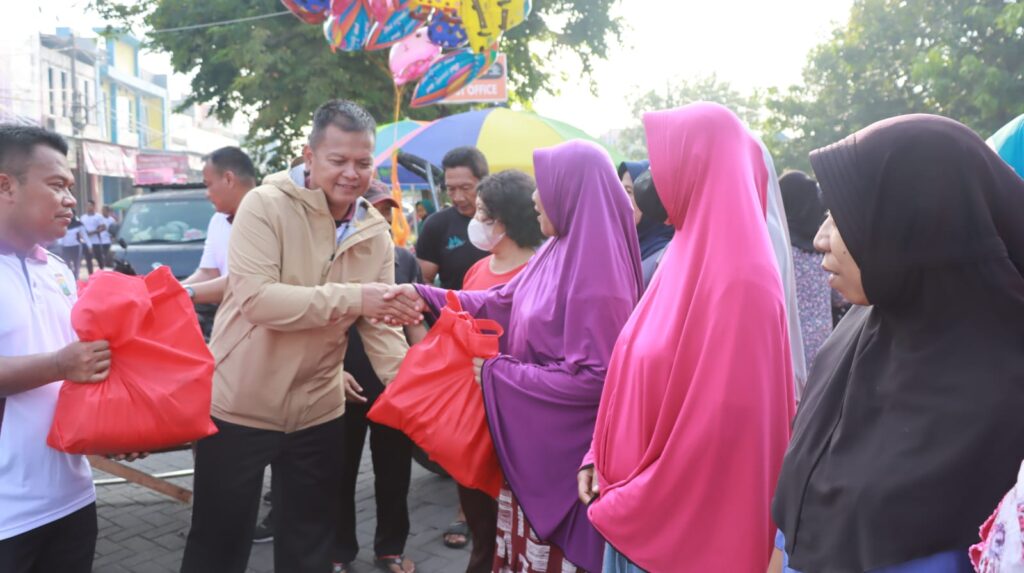 Saat menjumpai warga sekitar yang kurang mampu, Kapolresta Sidoarjo memberikan bantuan sosial berupa paket sembako. “Ada sekitar 200 paket sembako yang disediakan Polresta Sidoarjo untuk warga sekitar pasar, terutama warga kurang mampu,” kata Kombes Pol. Kusumo Wahyu Bintoro.