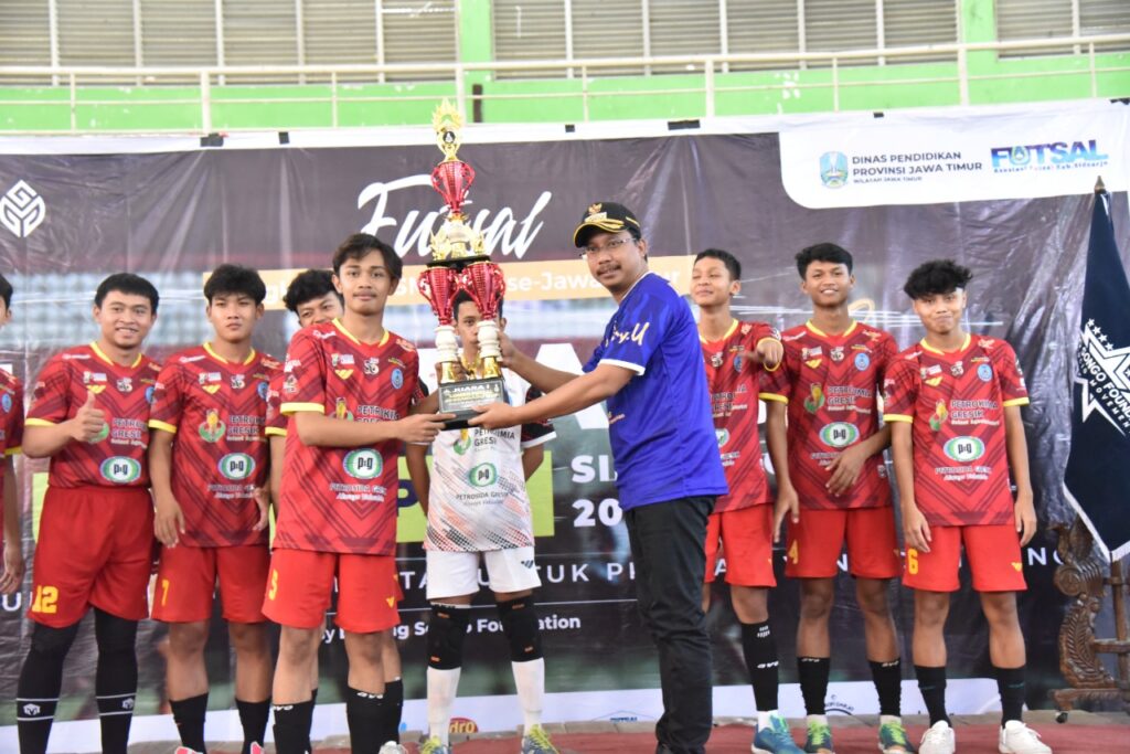 SIDOARJO. KemiriNews. Com | SMAN 4 Sidoarjo menjadi juara 1 turnament Futsal Jayandaru Cup Piala Bupati Sidoarjo 2022. Bupati Sidoarjo H. Ahmad Muhdlor S.IP atau Gus Muhdlor merupakan alumni sekolah tersebut. Siang tadi, dengan bangganya, trofi piala tersebut diserahkannya langsung kepada atlet futsal SMAN 4 Sidoarjo di gedung serbaguna GOR Sidoarjo, Minggu, (18/12).