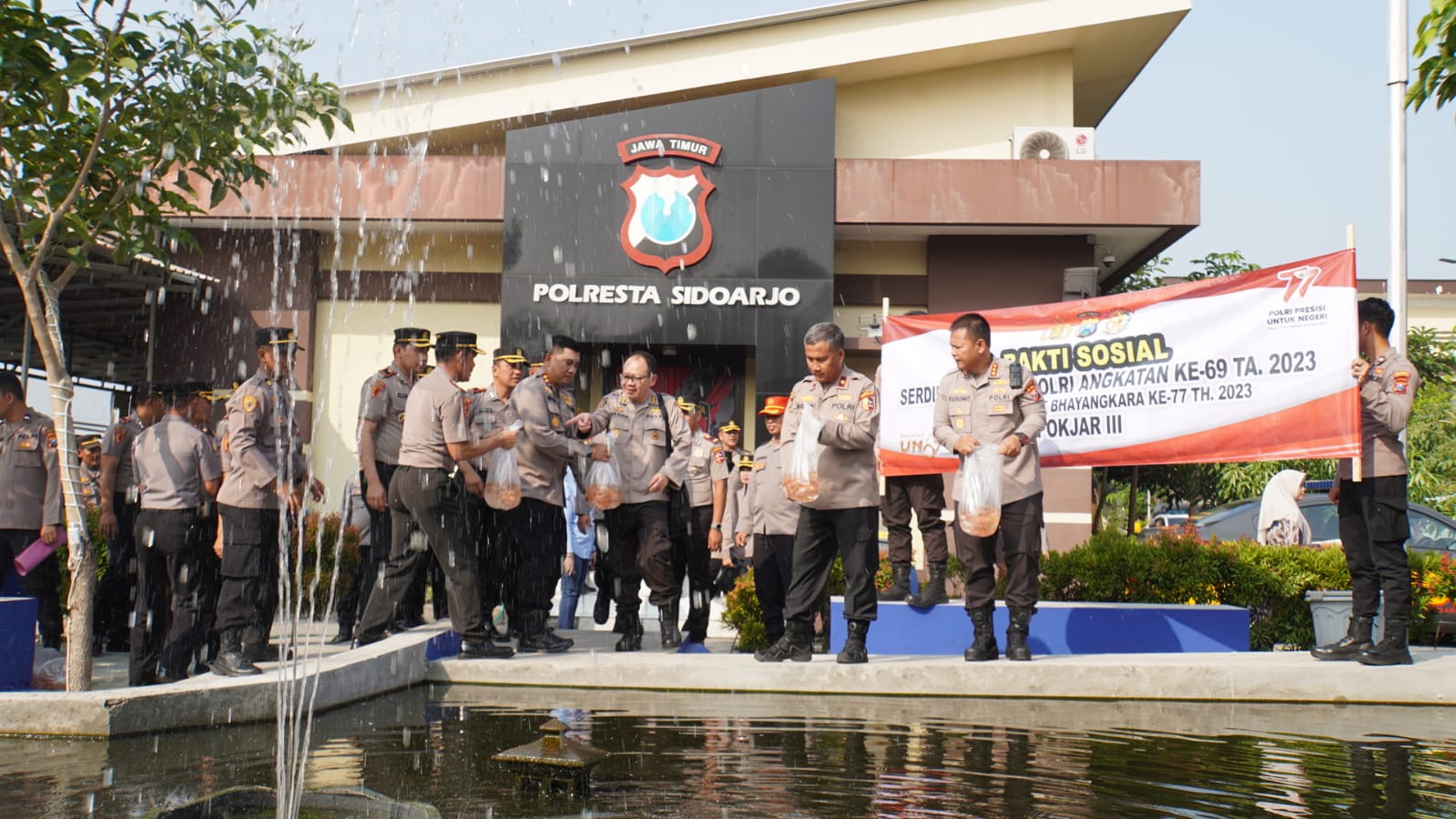 Sidoarjo. KemiriNews. Com | Di tengah melakukan Praktek Kerja Profesi (PKP) di wilayah hukum Polresta Sidoarjo, Peserta Didik Sekolah Pimpinan Pertama Polri (Serdik Sespimma) Polri Angkatan Ke-69 Tahun 2023 melaksanakan bakti sosial, pelepasan burung, penanaman pohon, tabur benih ikan dan donor darah.