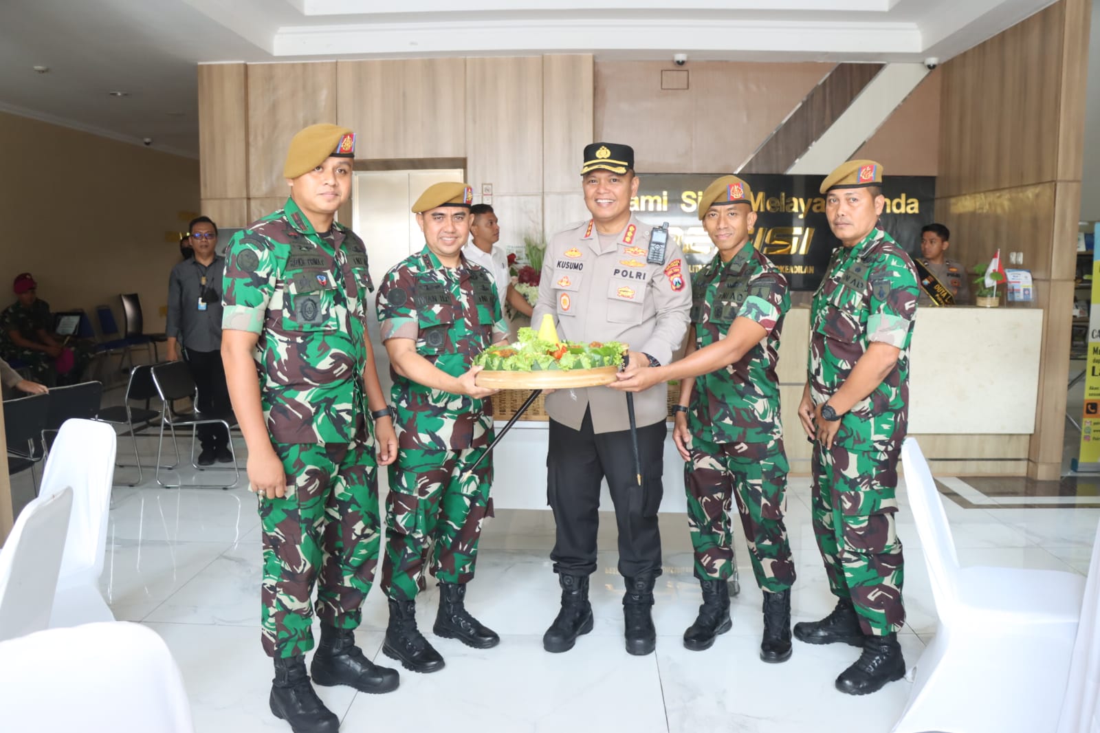 SIDOARJO. KemiriNews. Com| Jajaran TNI di wilayah Kabupaten Sidoarjo datangi Mako Polresta Sidoarjo, Senin (3/7/2023). Kunjungan kejutan ini dalam rangka berikan ucapan dan kado Hari Bhayangkara ke-77.