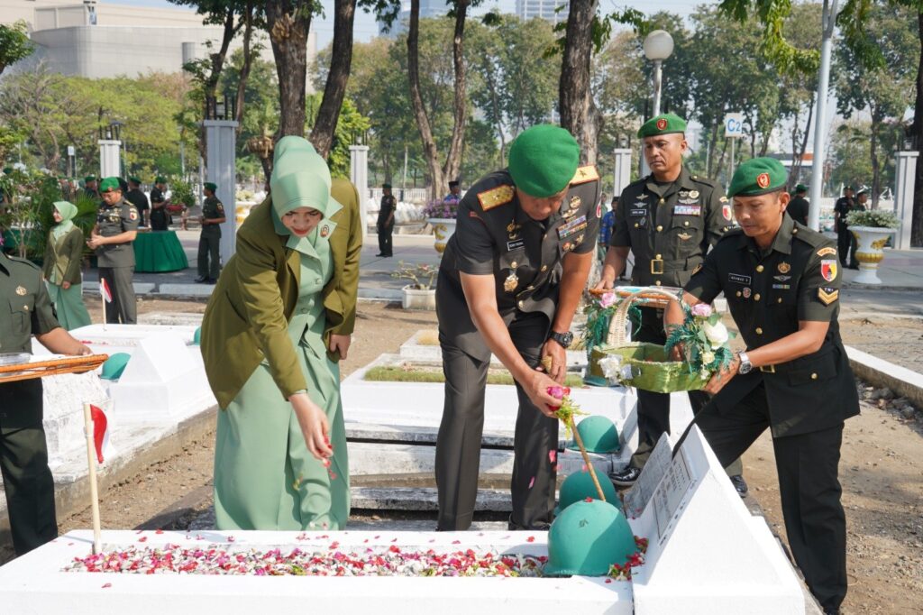 SURABAYA. KemiriNews. Com | Bertempat di Taman Makam Pahlawan 10 Nopember Suranaya pada hari Jum’at (28/7/2023), Danrem 084/Bhaskara Jaya Brigjen TNI Terry Tresna Purnama, S.I.Kom., M.M. memimpin ziarah rombongan dalam rangka HUT ke-57 Korem 084/BJ. Tampak hadir pada acara tersebut Kasiren Korem 084/BJ, para Kasi Kasrem 084/BJ, Dandim Jajaran kota Surabaya, para Kabalak Rem 084/BJ, ketua Persit KCK Koorcabrem 084 beserta pengurus, para Perwira dan perwakilan anggota dan PNS Korem 084/BJ.