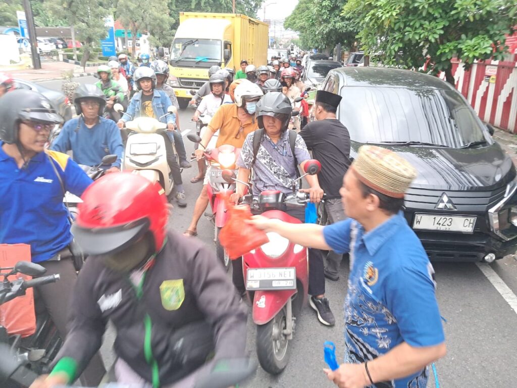 Kegiatan ini dipimpin langsung oleh Ketua PWI Sidoarjo, Mustain, yang turut langsung membagikan paket takjil kepada para pengguna jalan yang melintas.
