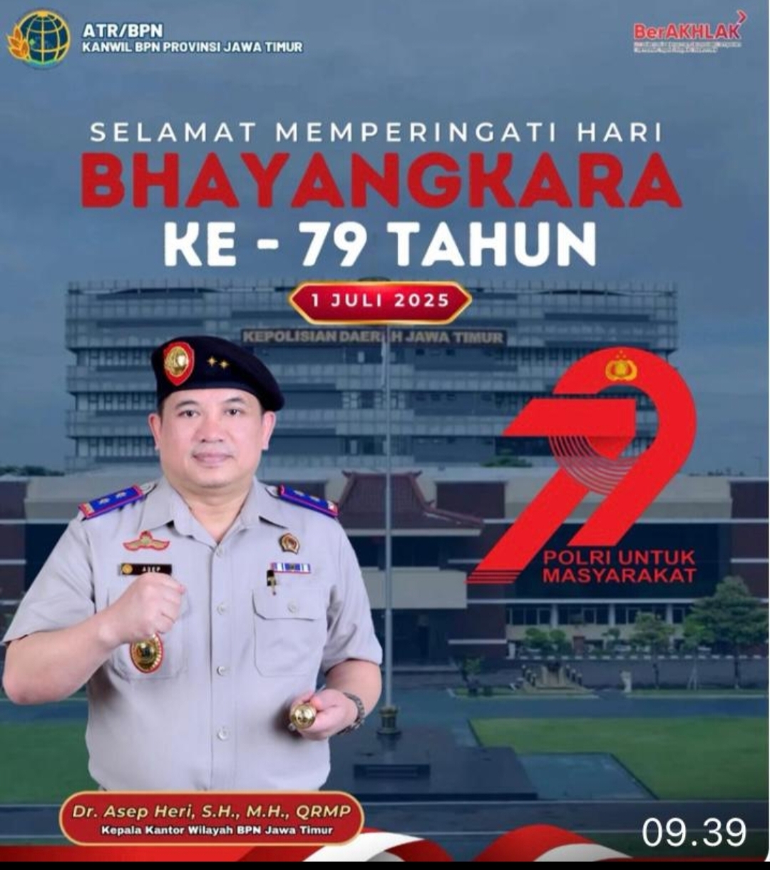 Sidoarjo Kepala Kantor Wilayah BPN Jawa Timur, Dr. Asep Heri, S,H., M,H., QRMP, Mengucapkan Hari Bhayangkara ke 79 Tahun Tim 1 Juli 2025 Post navigation Previous Previous post: Serentak, DJP Jawa Timur Blokir 3443 Berkas Penunggak PajakNext Next post: Peringati Hari Bhayangkara ke-79 Pemkab Sidoarjo : Apresiasi Kinerja Polresta Sidoarjo Tinggalkan Balasan Batalkan balasanAnda harus masuk untuk berkomentar. Related News Sidoarjo Bupati Sidoarjo Resmikan RS. Mitra Keluarga Sidoarjo, Berkapasitas 100 Bed 0 Sidoarjo Bupati Sidoarjo Lantik 260 Pejabat, Tekankan Integritas dan Percepatan Pembangunan 0