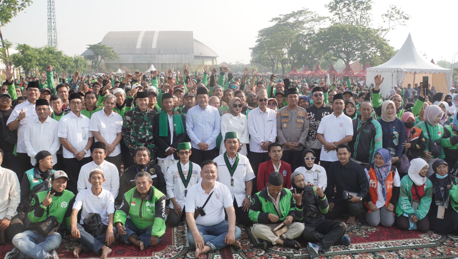 SIDOARJO. KemiriNews. Com | Forkopimda bersama lintas elemen termasuk mahasiswa dan ribuan Driver Ojek Online (Ojol) Sidoarjo menggelar doa bersama, yang berlangsung di Parkir Timur GOR Sidoarjo, Jumat (5/9/2025).