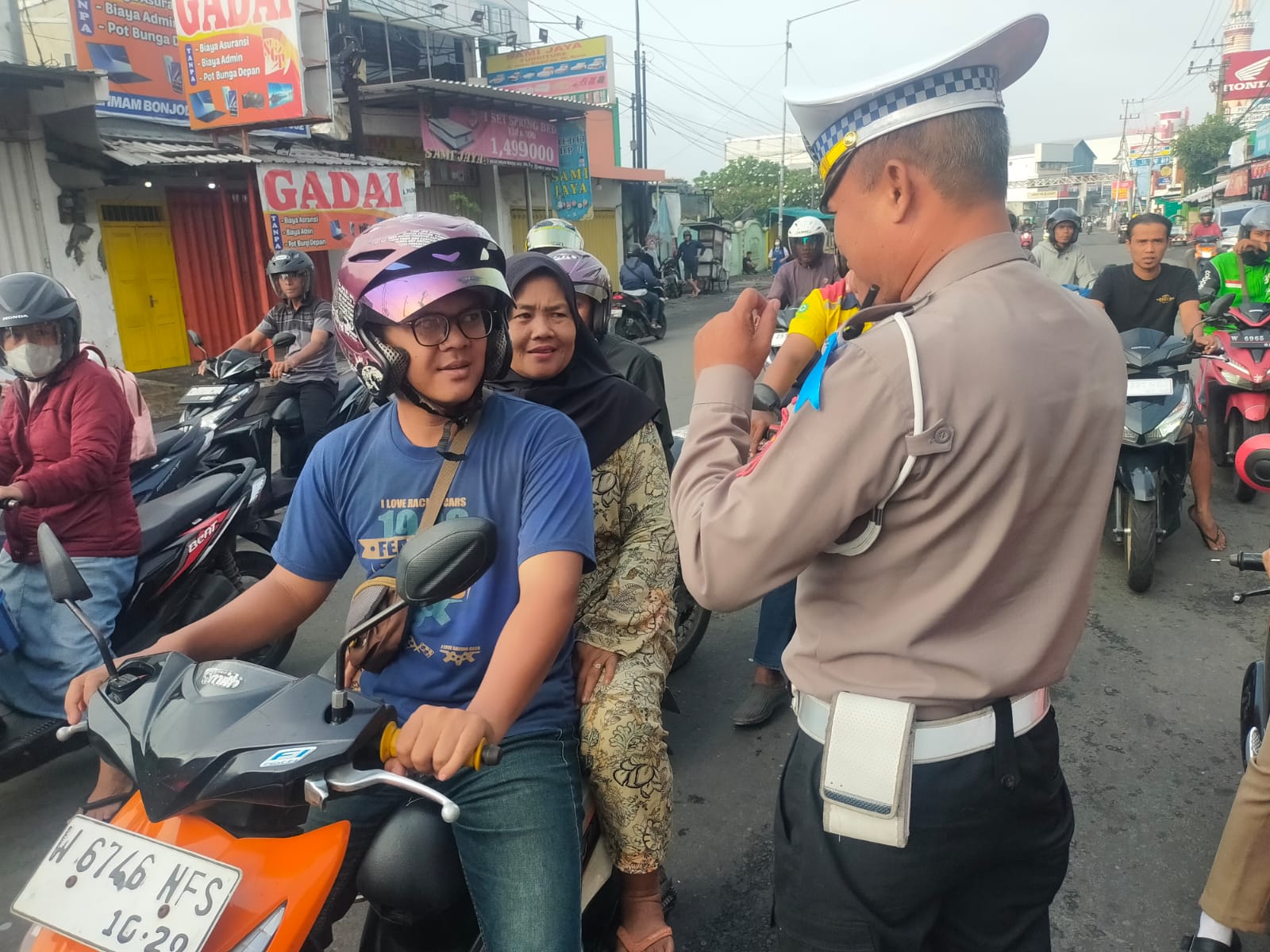 SIDOARJO. KemiriNews. Com | Dalam rangka pelaksanaan Operasi Zebra Semeru 2025, Kanit Lantas Polsek Krian Polresta Sidoarjo Iptu Indra Arliyansyah, memberikan tindakan humanis terhadap para pengendara yang melintas tanpa menggunakan helm di Simpang Lima Krian, Sabtu (22/11/2025).
